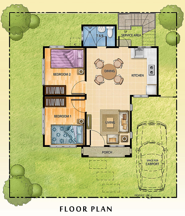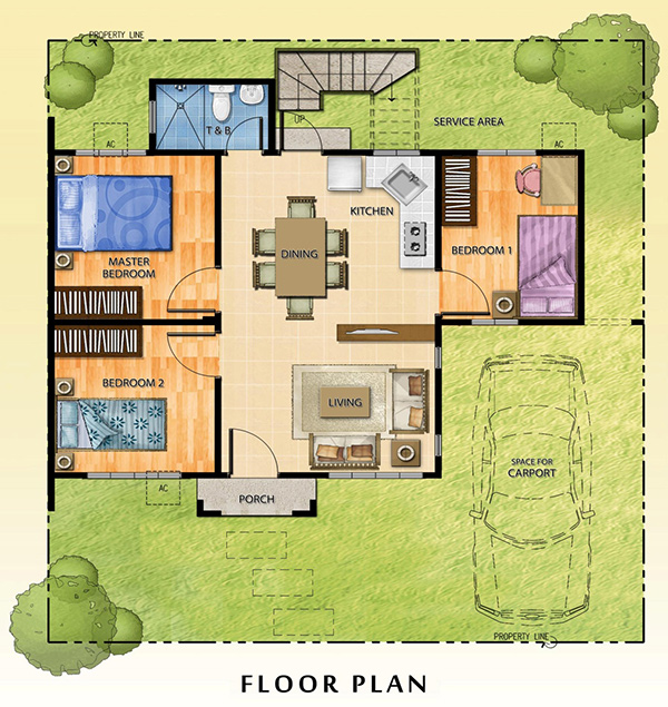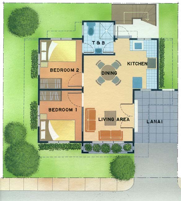 1. Molave House Model – This concept can be built in a lot with a minimum area of approximately 100 square meters with a total usable floor area of 84 square meters. An open garage is provided at the right side, small porch can be seen before entering the living area. Combine dining and kitchen is open to the living room making it more spacious since there are no dividers between these rooms. Two standard rooms are situated at the left side with common toilet and bath at the rear end.