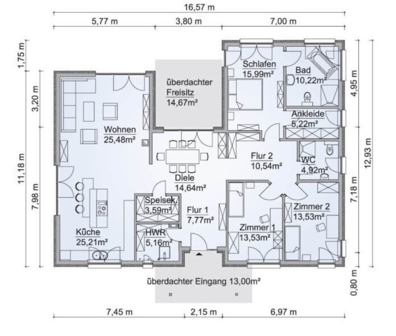 You will want for nothing with this bungalow. Both light and openness set the tone that features a spacious living and kitchen including a pantry. The living spaces occupy the left side, while the private zone sits on the right of the design. The master’s bedroom with an ensuite and dressing room sits at the back right corner. On the other hand, the secondary bedrooms and the guest bathroom are on the right front corner of the layout.