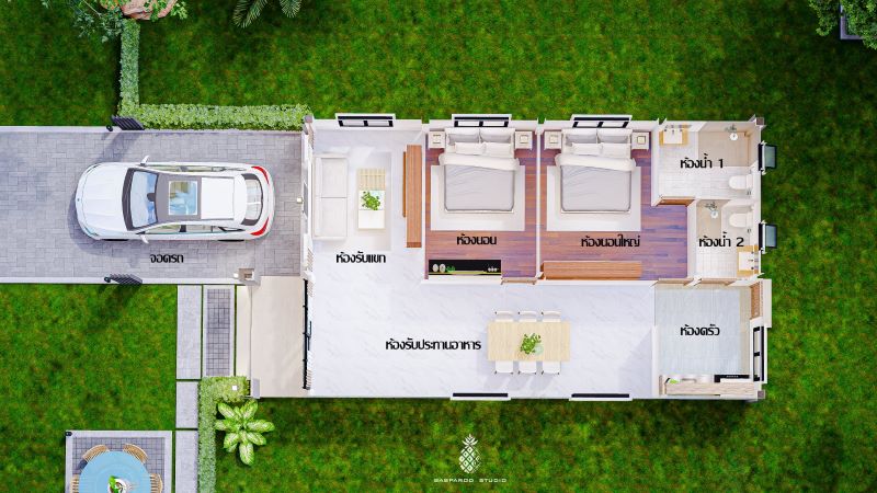 This design is full of unique and functional features. Starting with a lengthy driveway you will be greeted by a terrace as an entryway to the living room through glass doors. Once inside, you will notice the great living spaces in an L-shaped arrangement. The dining room and kitchen sit at the right of the living room that enjoys a free-flowing concept. Meanwhile, the two bedrooms and two bathrooms occupy the left side of the plan in front of the living room. The carport sits comfortably on the left corner of the house.