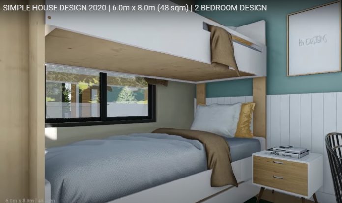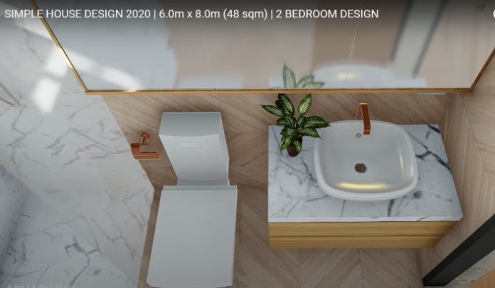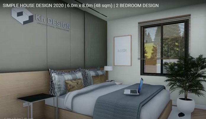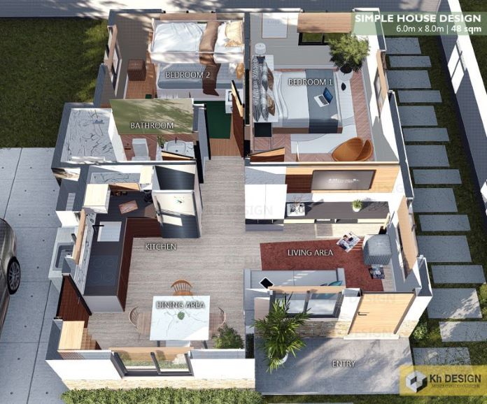 Simple but charming, this graceful design offers a modern style family plan. It stands in a lot that measures 6.0 x 8.0 meters and yields a usable space of 48.0 sq. meters. The usable building space hosts a living room, dining room, kitchen, two bedrooms, and one bathroom.