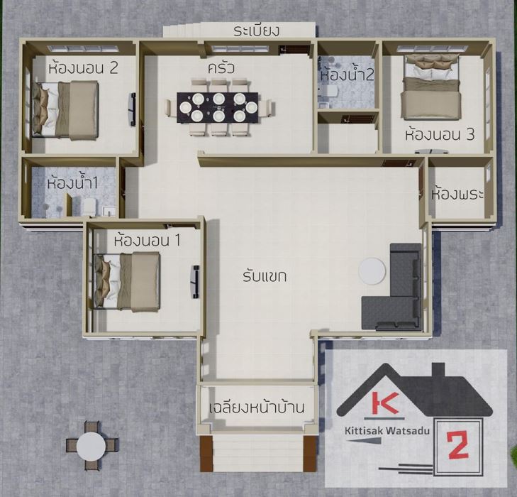 An inviting porch welcomes the residence leading to the comfortable living room through the sliding glass door. Few steps in front of the living room lies the combined dining room and modern kitchen. On the other hand, the three bedrooms occupy the three corners of the house, left and back right corner, where each room is accentuated by individual walk-in-closet. Meanwhile, two units of T&B are servicing the entire house.