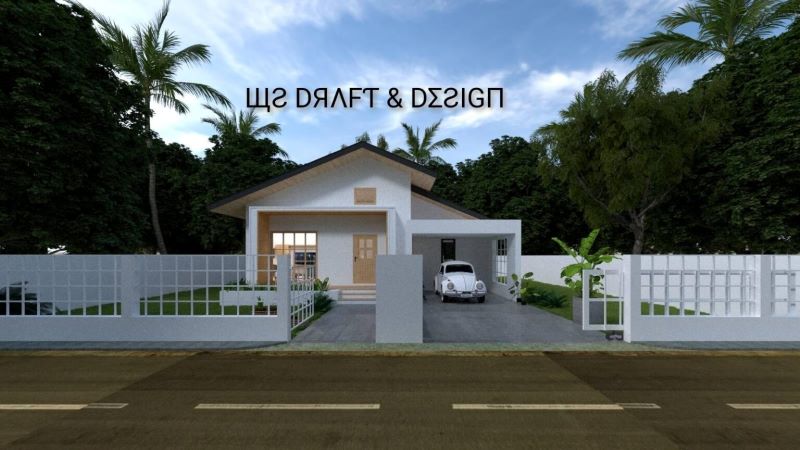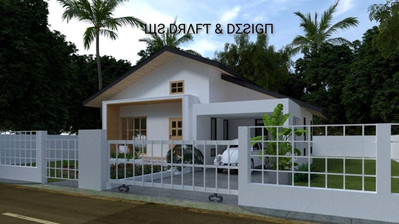 This design boasts coziness with a comfortable inner space and an airy outdoor space. It stands in a lot of usable space of 95.0 sq. meters that hosts a porch, living room, dining area, kitchen, two bedrooms, two bathrooms, and a carport.
