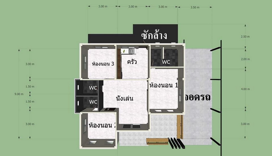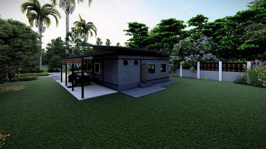 The residence in feature boosts an L-shaped veranda in elevated scheme that looks inviting with brown marble tiles and wooden bench which is perfect for relaxation. It leads to the family room through sliding glass door. As can be seen, the living spaces display a free flowing concept which promotes flexible mobility. Meanwhile, the master’s bedroom sits on the right section of the plan, while the secondary bedrooms settle on opposite corners of the left side of the design. The carport sits comfortably in a wide space on the right section of the house plan.