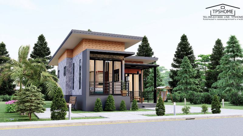 Meanwhile, the exterior registers a unique and stylish façade with a wooden wall cladding and slim window panels. Additionally, the exposed exterior walls are eye-catching in a salt concrete finish. Perhaps one of the excellent features of this design is the shed roof and ceilings both in grey color. The white-painted ceilings and brown gable are perfect elements that complete the roofing assembly.