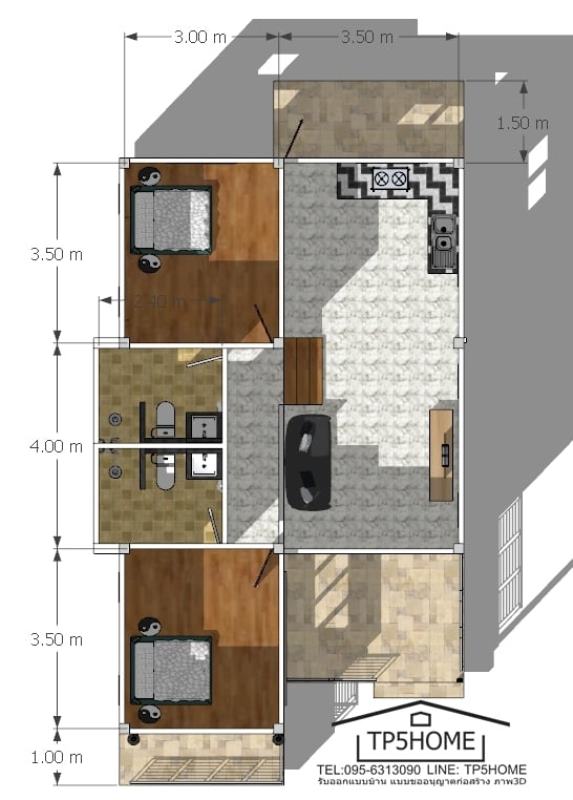 This bungalow house utilizes a building space that measures 6.5 x 11.0 meters. The design area of 72.0 sq. meters hosts a balcony, terrace living room, dining area, kitchen, two bedrooms, and two bathrooms.