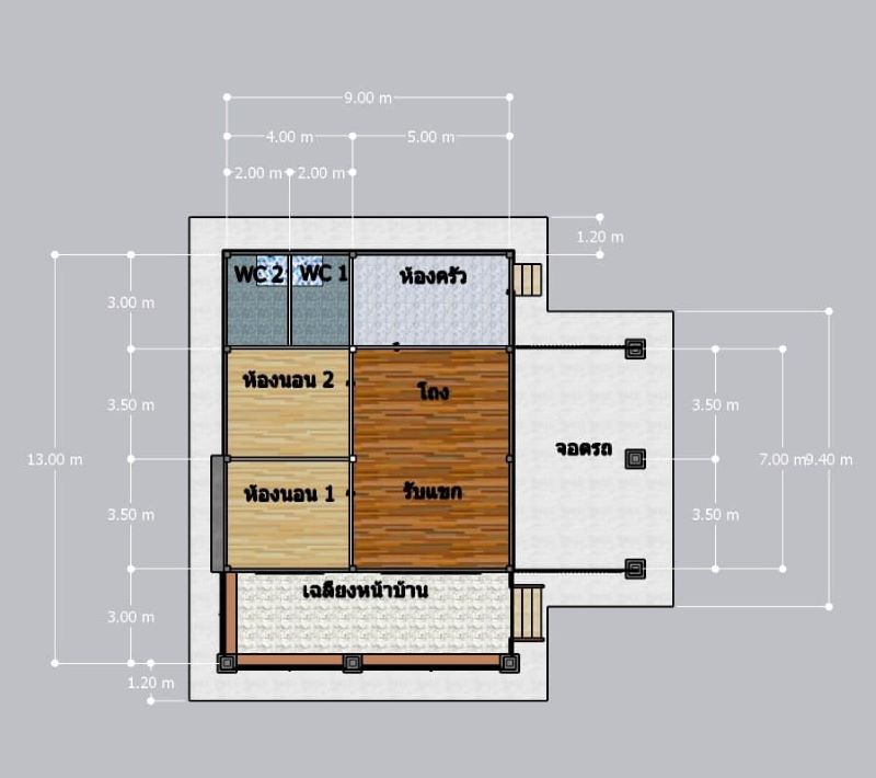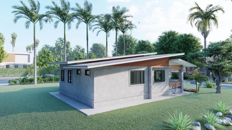 This design boasts coziness with an airy outdoor space. It stands in a lot that measures 9.0 x 13.0 meters that yields a usable space of 117.0 sq. meters. excluding the carport. The floor plan layout spreads to a verandah, living room, dining area, kitchen, two bedrooms, and two bathrooms.