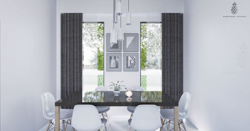 This dining room has a two-tone palette of dark grey and chalky white. The darker grey is used on the glass dining table and curtains with the other three walls painted in warm white, which makes the room feel more spacious.