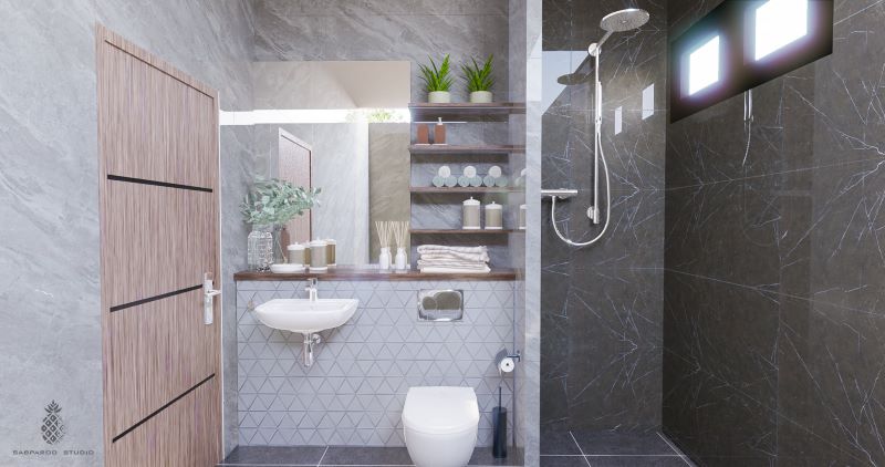 The bathroom carries similar shades as the other spaces that equally shine in grey and brown hues. It looks beautiful with light grey marble wall tiles on one wall and dark grey on the other face. What makes it into the seriously chic territory is the well-organized layers that store various toiletries and other stuff.