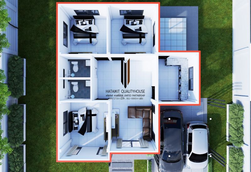 Meanwhile, the three bedrooms border the living spaces on three defined corners on the left and back sections. The master suite enjoys a private ensuite positioned on the front left corner, while the secondary bedrooms occupy the two corners at the back of the plan. The two-car garage finds its comfortable station on the right side of the house.