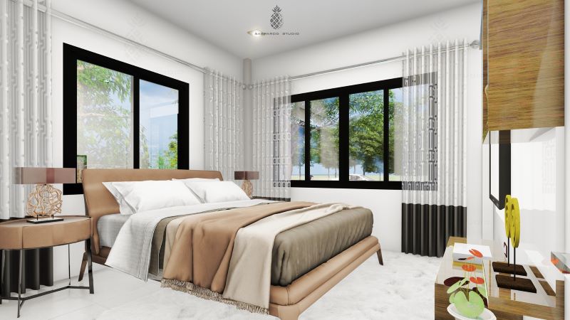 The elegance of the exterior extends to the inner space which also shines in a fusion of white and grey hues. White floors, white walls and curtains, ceilings, soft grey upholstery, and white tables create a pleasant look. The white-painted ceilings with volumes of light generate a bright internal space. Likewise, with enough glass windows, the natural light and air create a peaceful and comfortable space.