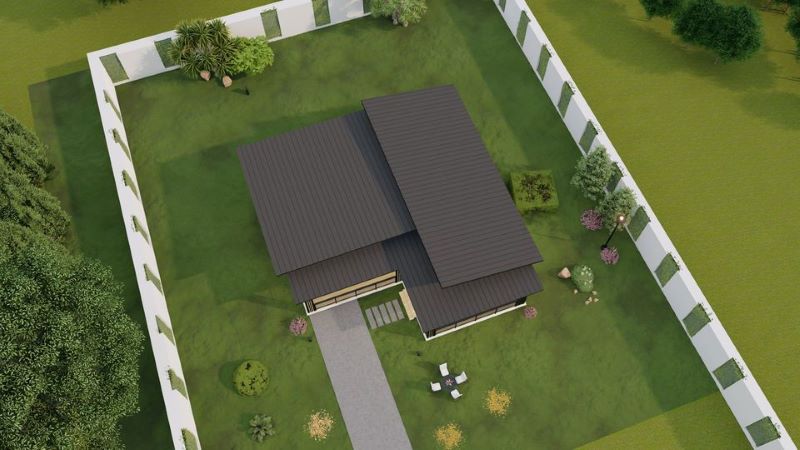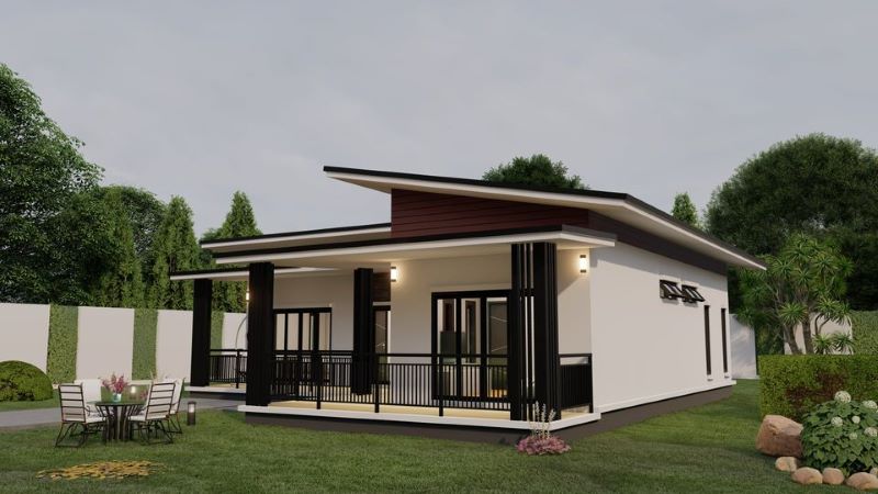 The graceful shed roof styling of this design offers not only exterior good looks but interior beauty as well. The roof looks very prominent with grey tiles, white ceilings, and a brown gable. Meanwhile, if you consider the spotless exterior walls in cream paint, the entire design is an elegant masterpiece.