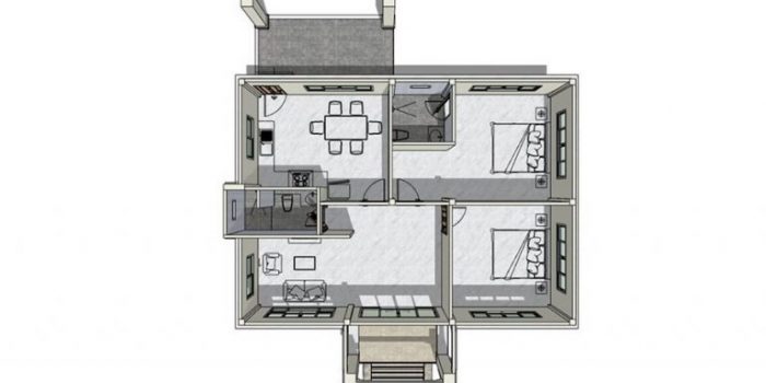 The floor layout features an open porch at the middle of the front elevation leading to the living room through the sliding glass door. Since the size is small, then the spaces are designed properly to make them more functional. The living spaces settle on the left portion of the plan while the private zone of two bedrooms sit comfortably on the right side of the design.