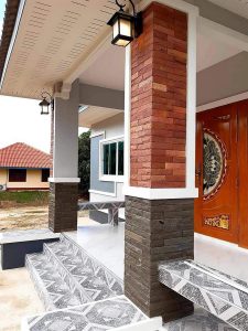 The elegant front exterior displays the prominence of the columns with black and maroon natural stones. The wooden door exudes a different level of class.