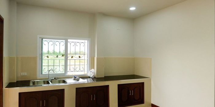 Elsewhere, the kitchen bears a simple design, but its simplicity appears great with brown floor tiles, white wall and brown slabs and cabinets.