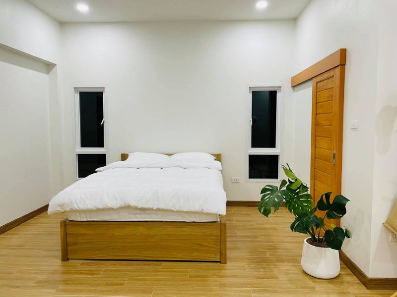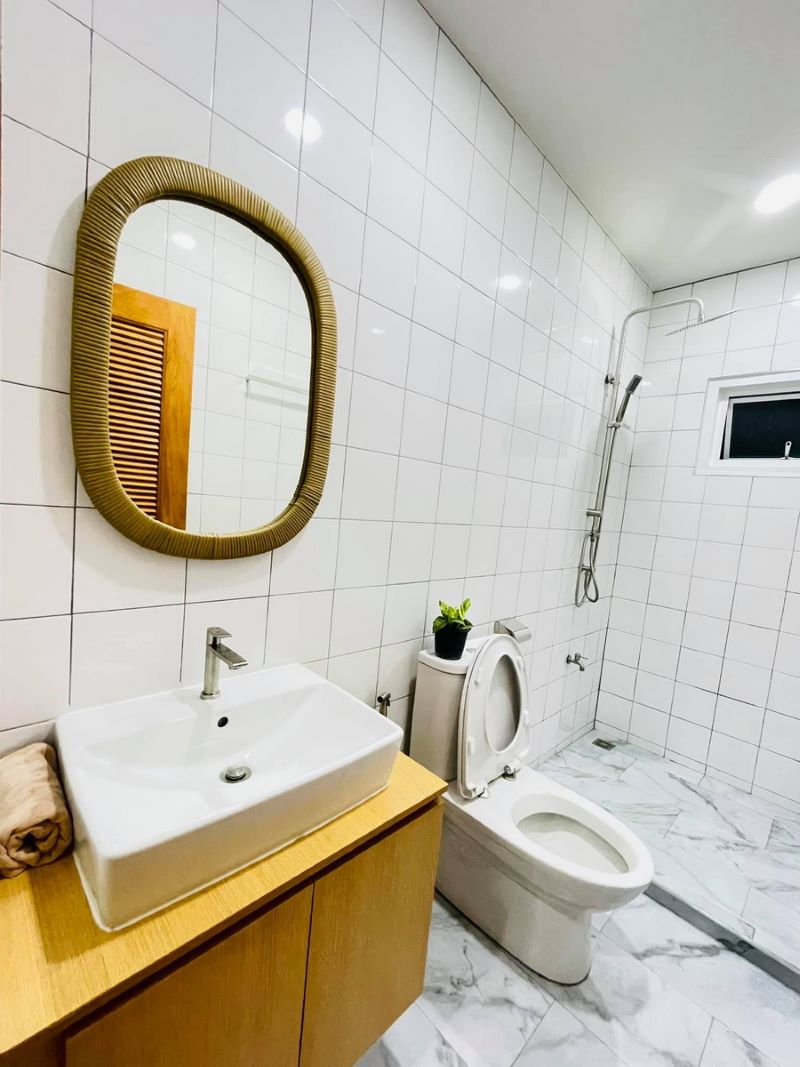 The lovely styling is visible from the tidy and polished assembly of the high-pitched gable roof with grey-colored tiles complemented by white ceilings. It is a smart concept to have high ceilings as it offers an immediate sense of light and space. Consequently, the concept increases the internal comfort level. Meanwhile, the exposed exterior walls look spotless in a white plaster finish that exudes class and elegance.
