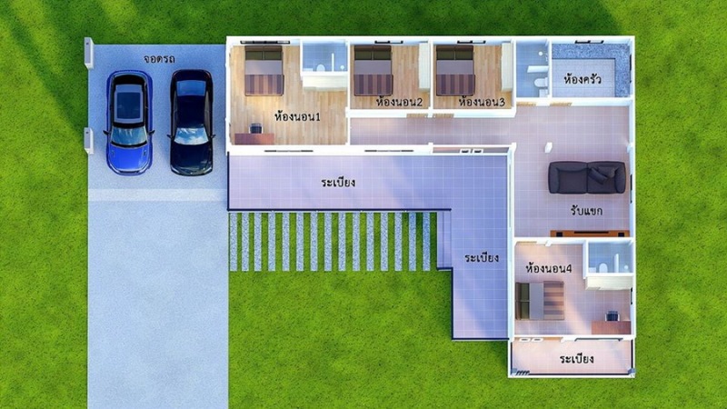 A modern design in L-shape, it features a well-organized but functional layout. It includes a spacious verandah in the front and a terrace on the right side. The verandah welcomes the residents to the living spaces located in the corner of the plan. They enjoy a free-flowing concept that promotes better mobility. The three bedrooms are arranged in a rectangular scheme on the left section of the design. Meanwhile, the fourth bedroom sits adjacent to the living room in the front corner of the plan. There are three bathrooms that serve the entire residence.
