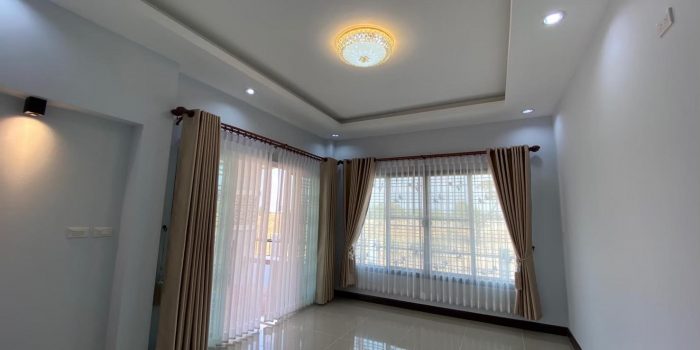 Moreover, the interior feels so comfortable because of the large glass windows that provides plenty of air for ventilation. The walls shine as well with brown curtains fixed all around creating a pleasant blend with the surroundings in signal white tone.
