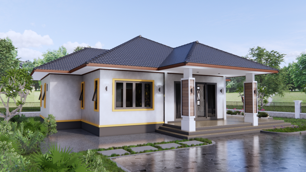 - elevated L-shaped verandah designed with brown marble tiles, square columns with accents of veneer stones and secured by an extended hip roof