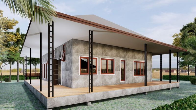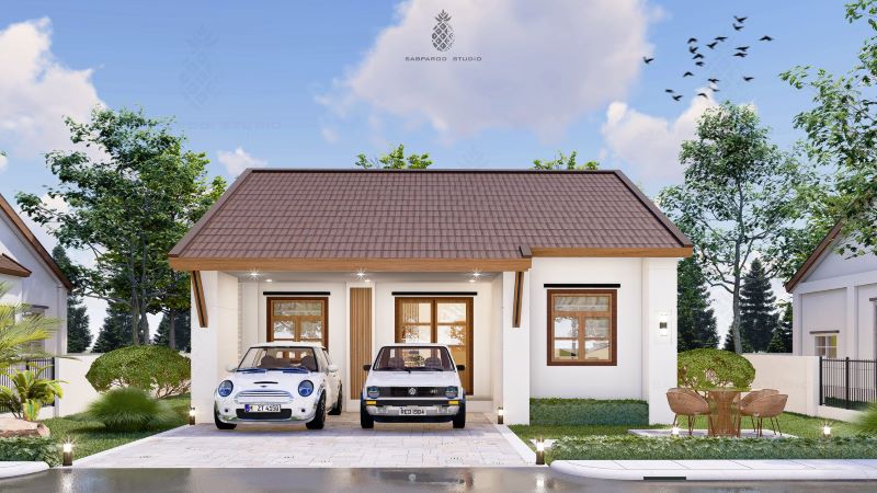 The exterior walls in raw cement finish deliver a unique character. You may apply grey paint for a more refined exterior wall. The concept will create a perfect match with the grey roof. Meanwhile, the statuesque averaged-pitched hip roof with grey tiles and white ceilings is aesthetically graceful. The eaves that cover the entire balcony is simply revealing and amazing.
