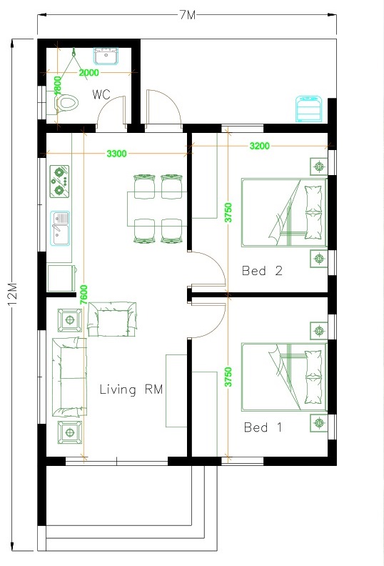 This cool two-bedroom single story residence measures 12.0 x 7.0 meters giving a total livable space of 65.38 m². Small as it is, it stands to have the complete amenities and services of a true home. The living spaces settle at the left section of the plan while the bedrooms occupy the right portion. There is not much complication in designing as the area is not so big. It requires only a smart concept to accommodate all the regular elements of every home.