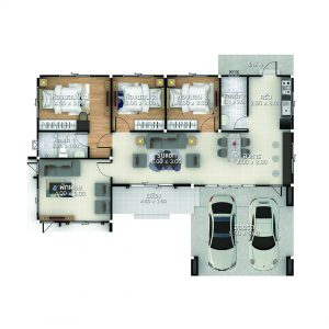 The private zone of three bedrooms occupies the back portion of the layout. The master suite that enjoys a private bath and walk-in robe sits on the lefty back corner. On the other hand, the secondary bedrooms with individual walk-in closets are just in front of the living room. Meanwhile, the two-car garage sits comfortably on the front right corner of the house.