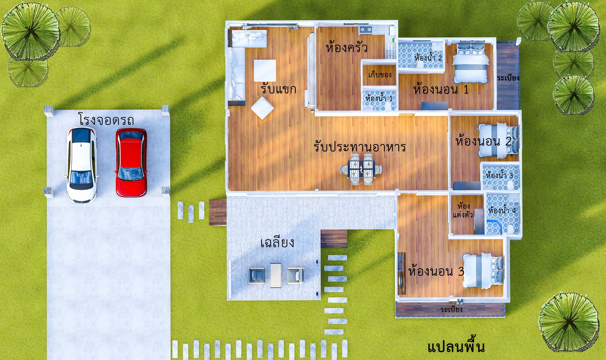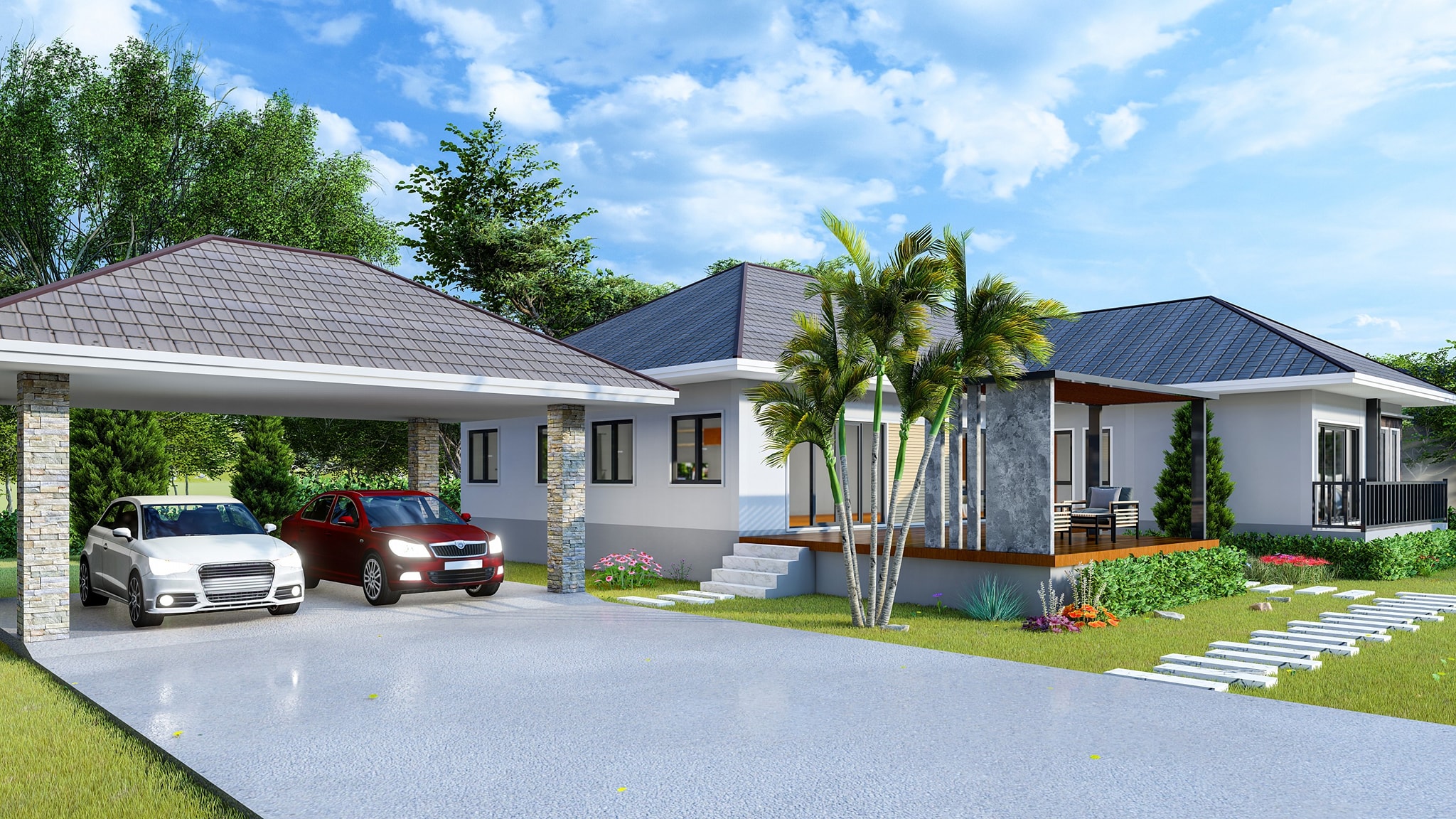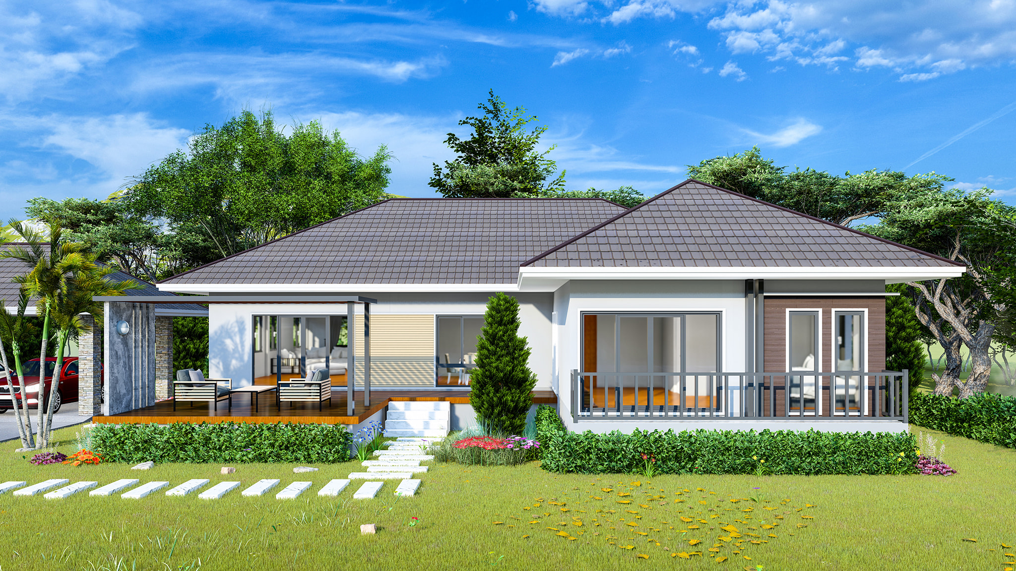 • a gorgeous verandah designed with marble floor tiles, a rectangular marble wall, and columns with accents of natural veneer stones; and secured by a flat roof