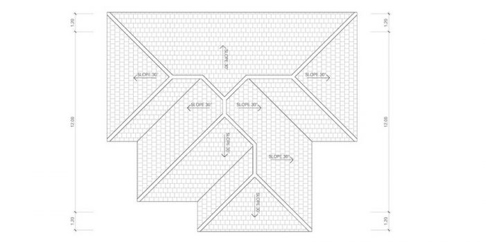 The highlight of the plan is the well-defined assembly of the roof in a hip style scheme with clay tiles in a sepia brown tone.