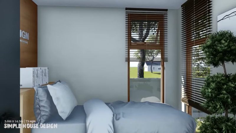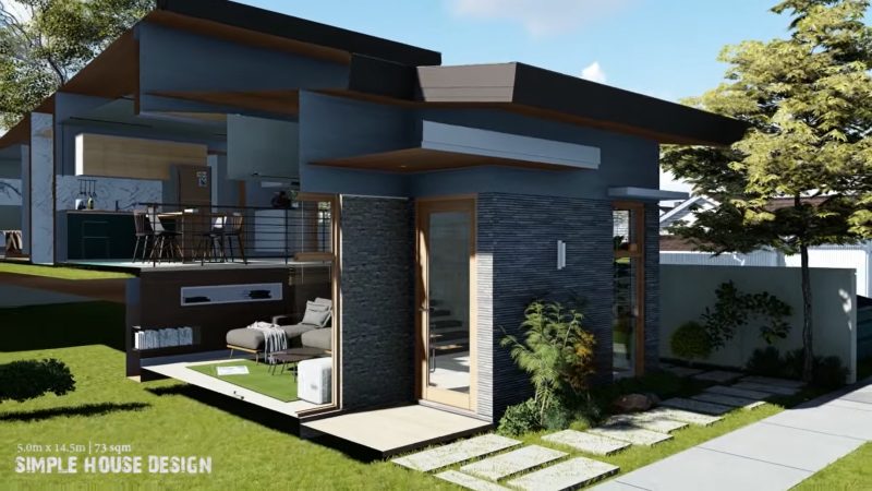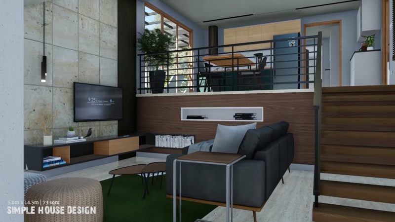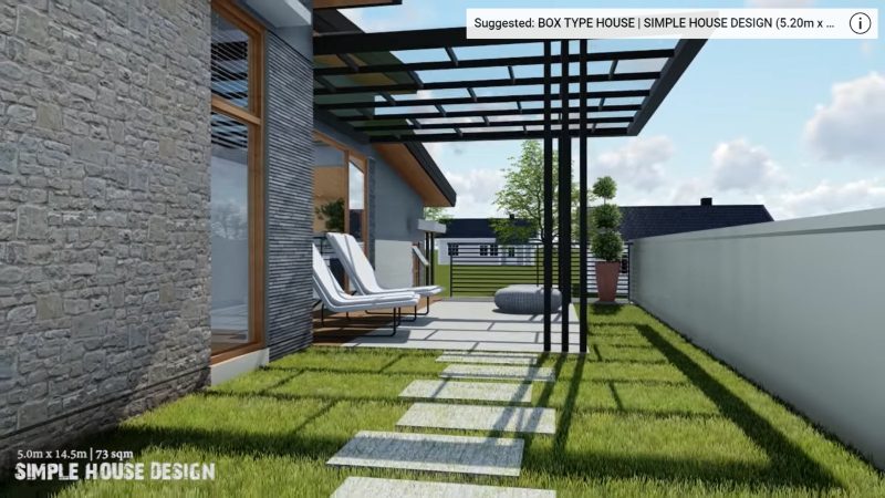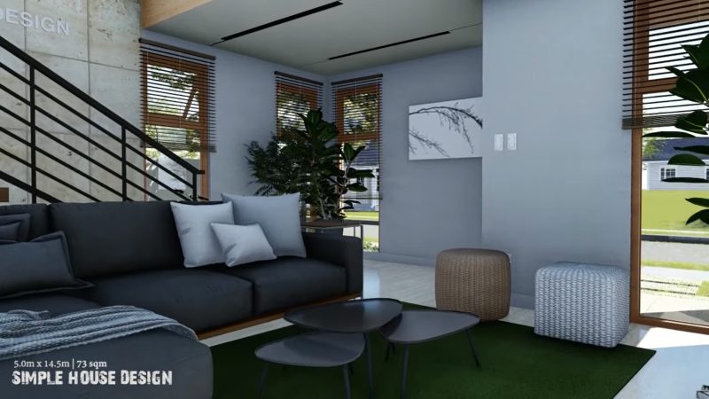 This modern family plan with a stylish interior layout stands in a lot that measures 5.0 x 14.5 meters and yields a usable space of 73.0 sq. meters. The usable building space hosts a porch, living room, dining room, kitchen, two bedrooms, one bathroom, washing area, and lanai.