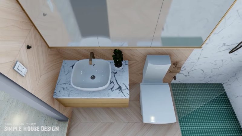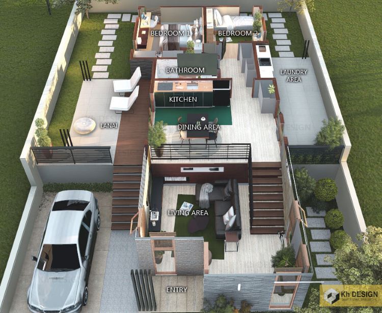 Meanwhile, the two bedrooms settle side by side at the back section of the plan. There is a dedicated space at the back for the washing area, The lanai and washing area are connected by a rectangular footpath with a garden around.