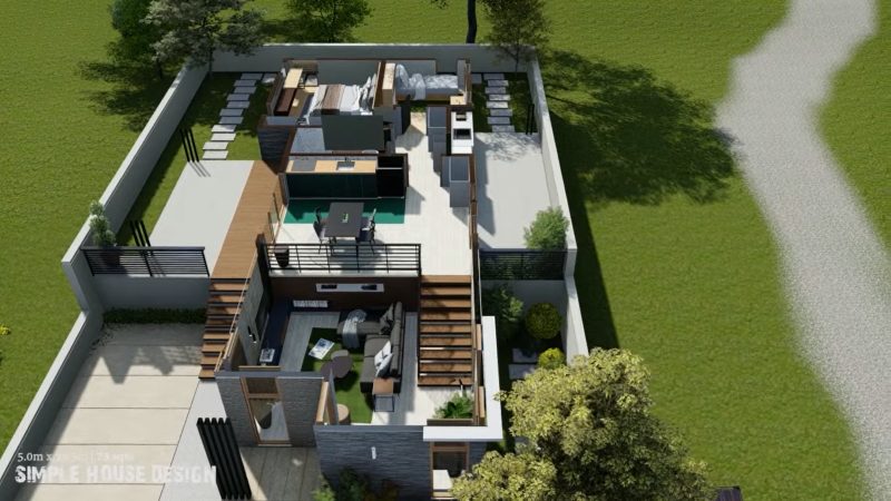 What is amazing about this design is its split level house concept. The living room is recessed, while the rest of the house components are in an elevated set-up. Moreover, the design is unique wall cladding with an enormous quantity of natural stone elements utilized in the entire facade.