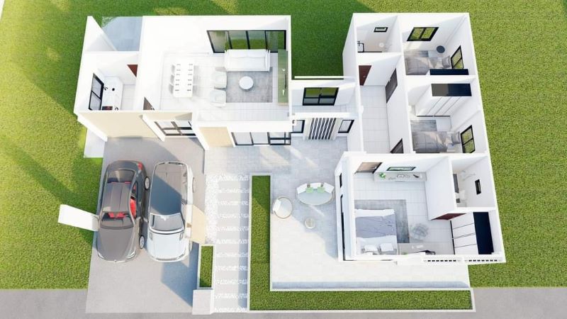 This captivating contemporary style home plan that stands in a cozy surrounding has 152.0 sq. meters of usable building space. The floor area spreads to an open porch and balcony, living room, dining room, kitchen, three bedrooms, three bathrooms, and, a two-car garage. The plan showcases a smart design that depicts a high level of privacy.