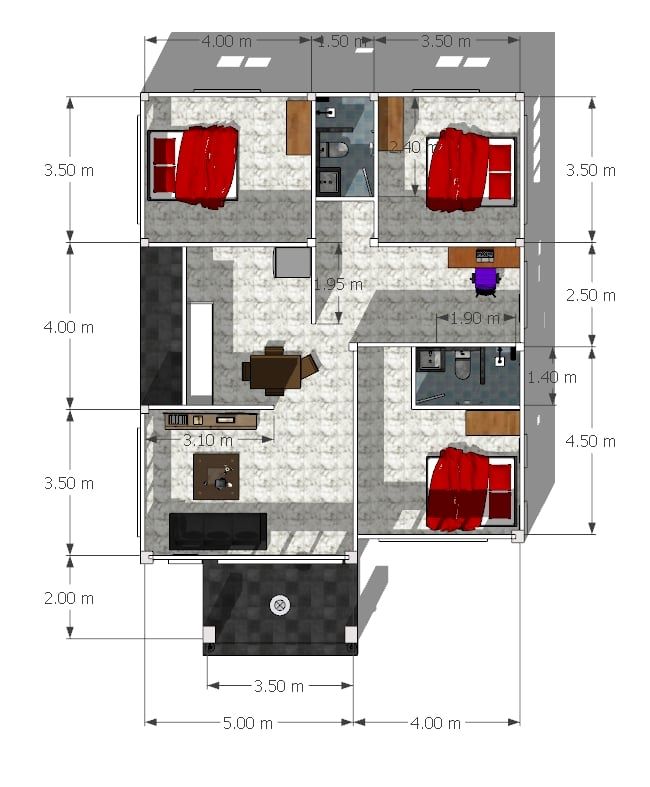 You discover a house of aesthetics and comfort with a functional layout and dedicated spaces. A property lot that measures 8.0 x 13.0 meters is utilized to construct this building. The usable space of 95.0 sq. meters spreads to a terrace, living room, dining room, kitchen, three bedrooms, and two bathrooms. With a free-flowing concept, the level of mobility is well-defined.