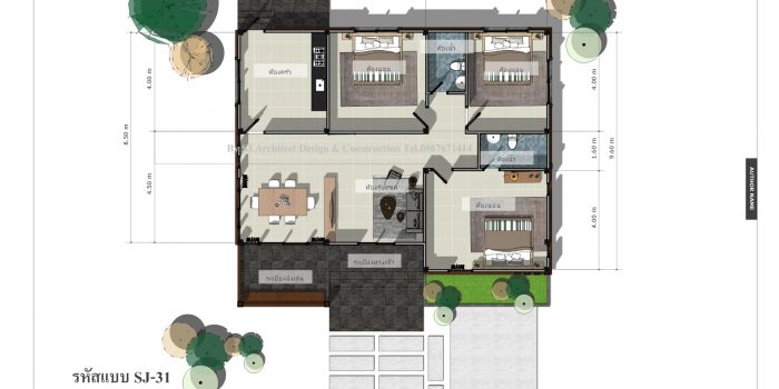 The lovely natural exterior and comfortable bedrooms will make you feel instantly at ease the moment you set foot into this house. After moving through the main entrance glass door, you will find yourself at the heart of the great room, It enjoys an open concept with the dining room and kitchen on the left side of the plan. Meanwhile, the private zone of three bedrooms occupies the right and back sections. The master suite with a private T&B sits comfortably on the front corner, while the secondary units sit side by side at the back.