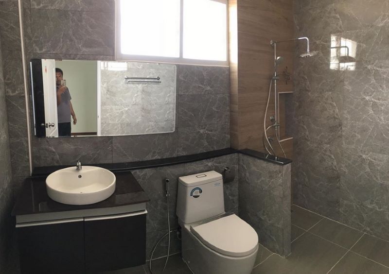 The bathroom is designed utilizing a dominant grey shade from floor to walls with an accent of brown. The concept creates a deep appeal but at the same tome energizes the space.
