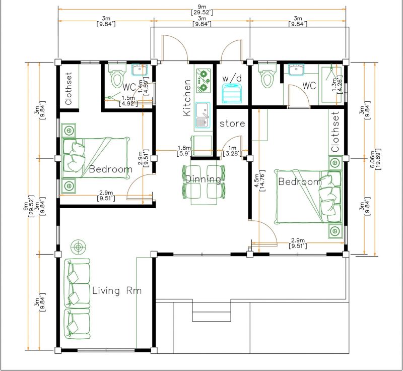 This modern design features a graceful outdoor space and a smartly-designed interior layout. The squaree lot measures 9.0 x 9.0 meters and yields a usable space of 81.0 sq. meters. The space provides a terrace, living room, dining room, kitchen, two bedrooms, two bathrooms, a storage area, and a washing area.