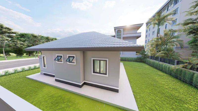 The well-designed cross hip roof assembly that encases and secures the structure has nothing to offer but beauty and elegance. The entire roof with grey-colored tiles, grey fascia board, and white ceilings shines excellently with grace.