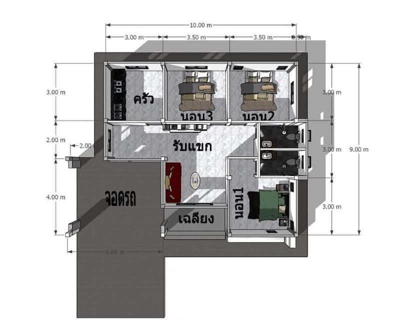 An elegant house utilizes a rectangular lot that measures 10.0 x 9.0 meters built in a comfortable environment. The usable space of 90.0 sq. meters hosts a porch, living room, dining room, kitchen, three bedrooms, two bathrooms, and a two-car garage.