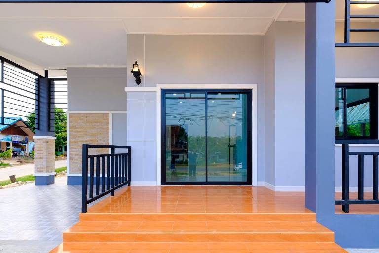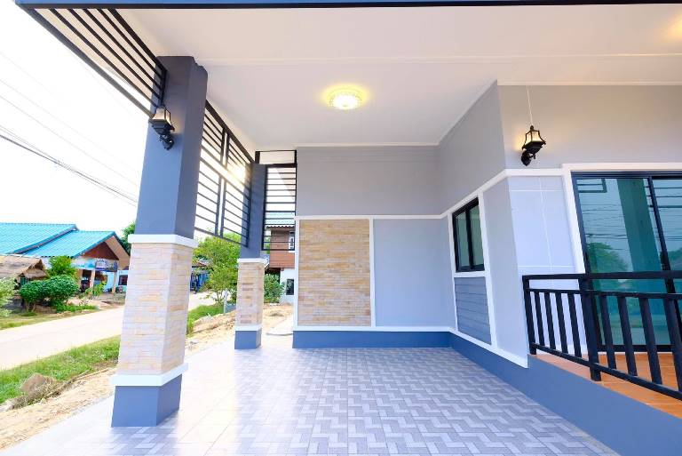 The residence opens with an open porch leading to the living room through the front door. The space has plenty of natural air and light penetrating through the sliding glass door. This house is elevated from the main grade line to heighten the aesthetic appeal. Consequently, the practical idea brings the overall elevation looks taller which delivers an extra charisma.