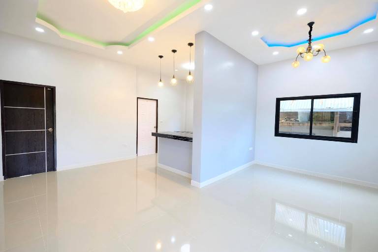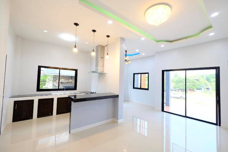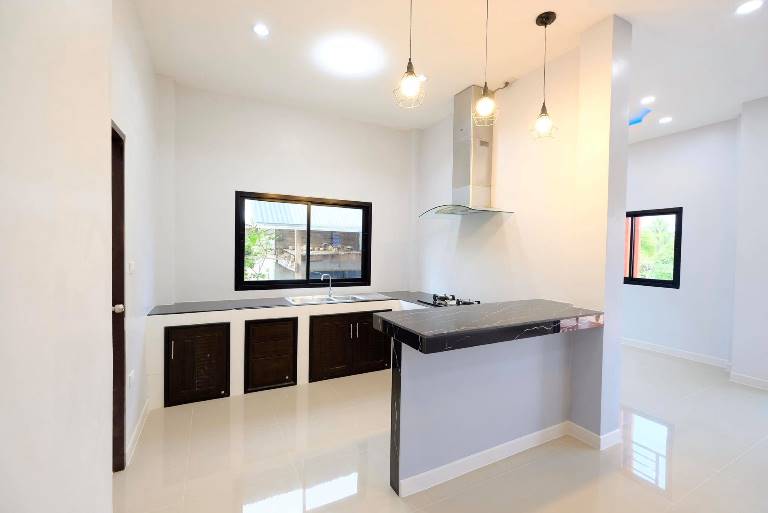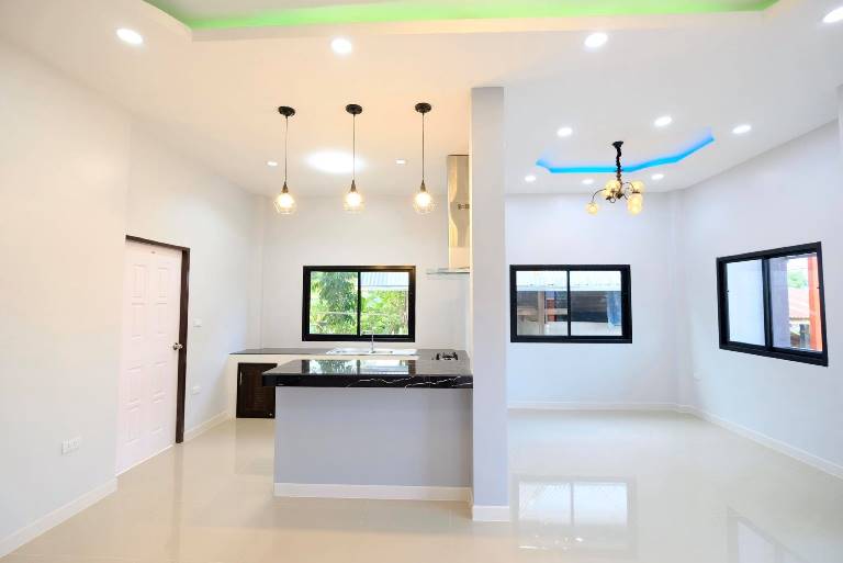 Meanwhile, the kitchen oozes with considerable appeal. The design is modern with black marble slab. There is an adjacent counter for quick meal services. It looks even brighter with an excellent ceiling with pearl shade and sufficient lightings. The dining room is only few paces away which is a great idea for accessibility.