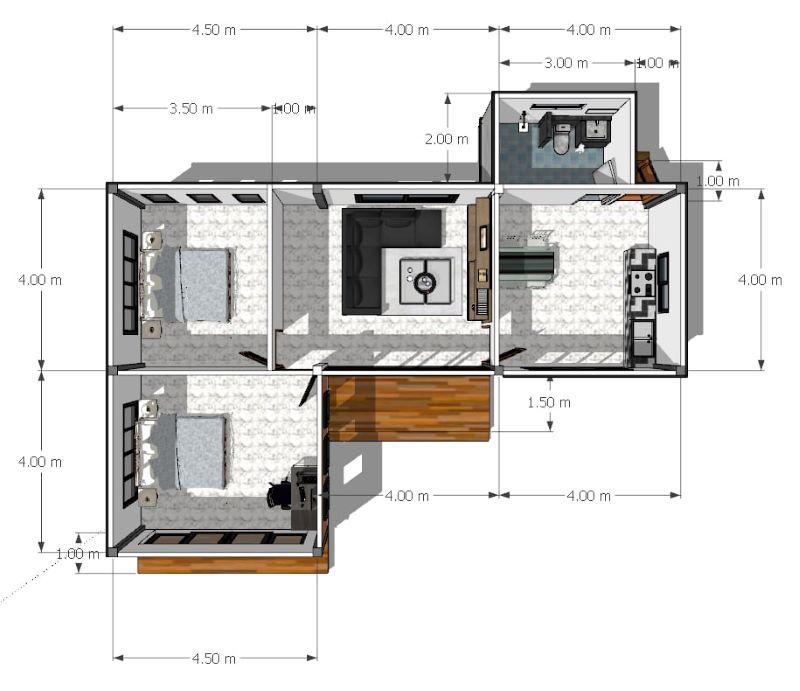 This modern house sits in a lot that measures 12.5 x 9.0 meters. It has an L-shaped internal floor layout with a usable space of floor area of 87.0 sq. meters, Standing in the middle of a lovely landscape, it offers the family a high level of comfort. The layout hosts two terraces, living room, dining area, two bedrooms, kitchen, and one bathroom.