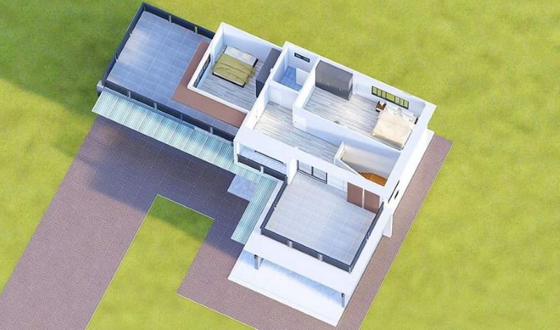 Meanwhile the staircase on the middle right will guide you to the upper level. It hosts the master suite, a secondary bedroom, a bathroom, and two large decks. These open balconies highlight this design where purposely serve to be additional spaces for family functions. Additionally, they can be more functional as extension of the inner spaces for relaxation, or hosting events and outdoor dining where you can enjoy a relaxed night session with the stars. A clear view of the outside surroundings and neighborhood will be perfect to view form here.