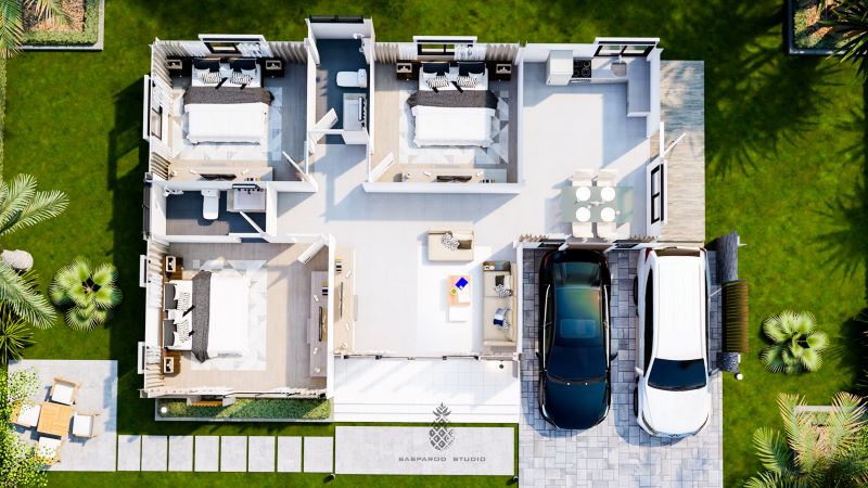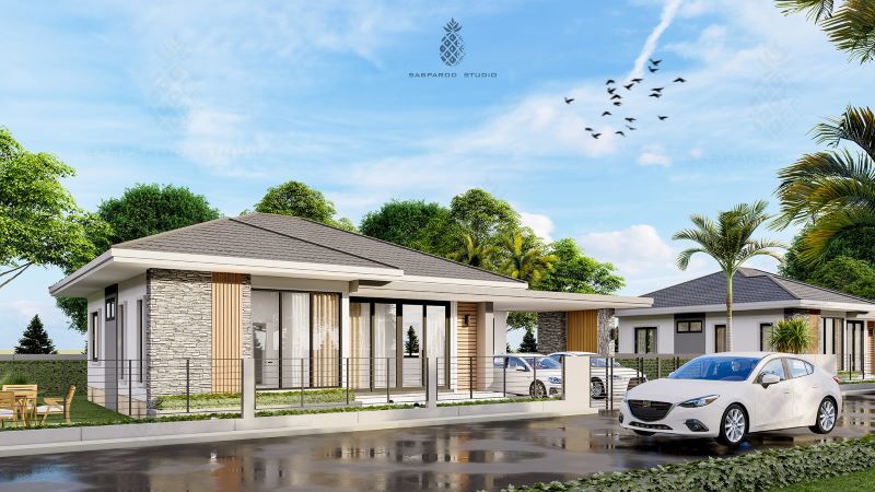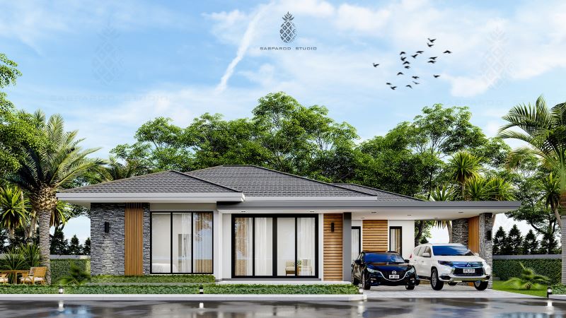 The living spaces in an L-shaped layout sit in the middle and left sections. On the other hand, the private zone of three bedrooms borders the living room on the right and in front. The master suite occupies the front corner, while the secondary bedrooms sit side by side at the back. Meanwhile, the carport finds it comfortable spot on the right front corner of the design.