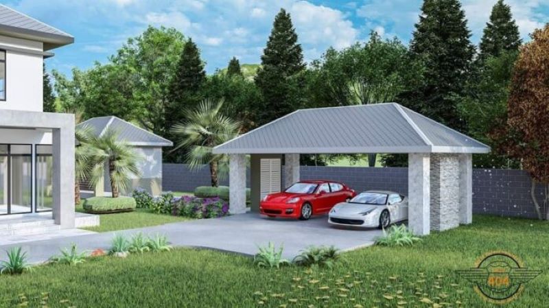 - well-designed two-car garage secured by rectangular pillars and concrete flat roof