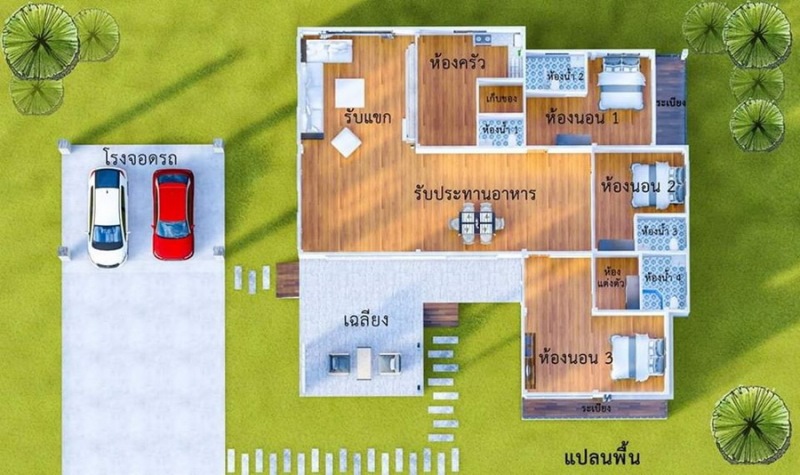 This modern design is a welcoming home plan with excellent curb appeal, beginning right away with a striking multi-purpose verandah. From the verandah, you will see the living room that enjoys a free-flowing concept with the dining room and kitchen in an L-shaped scheme. Meanwhile, the three bedrooms each of which has an attached bathroom occupy the right section of the layout. While the living spaces offer an open plan, and are perfect for entertainment, the private zone, on the other hand, delivers a high level of privacy.