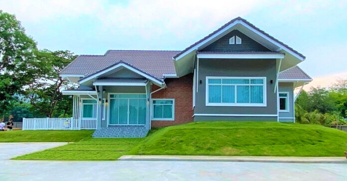Incredibly impressive is the symmetrical and well-designed cross gable roof with grey-colored roofing sheets, white ceilings. and grey gable. Meanwhile, it will take a single viewing to note the exterior walls with touches of plaster finish in grey tone. Additionally, the outlines in a classy white shade visible in the entire exterior façade look elegant.
