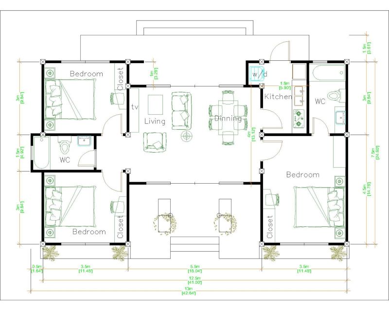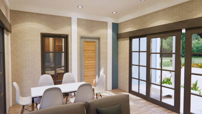 This straightforward plan features a symmetrical layout with respect to the center. You will enjoy a full stop at the gorgeous terrace, enjoy the space and then move to the inner space through glass doors. Once inside, you will notice the great living spaces in the middle of the plan and is accessible from the front and back glass doors.