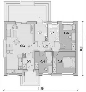 A lovely one story house, this modern bungalow house design stands in a building area that measures 11.69 meters wide and 8.59 meters long with a total usable building space of 100.00 sq. meters. This residence is specifically designed for families who value modern design that offers style and comfort. This house has a great organization and has an impressive internal layout and room arrangements. As can be seen, the living spaces demonstrate an open and free flowing design.