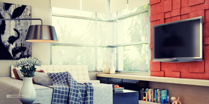 Here is a view of the family room where in contrast is a little dramatic with the choice of materials, setting and concept.