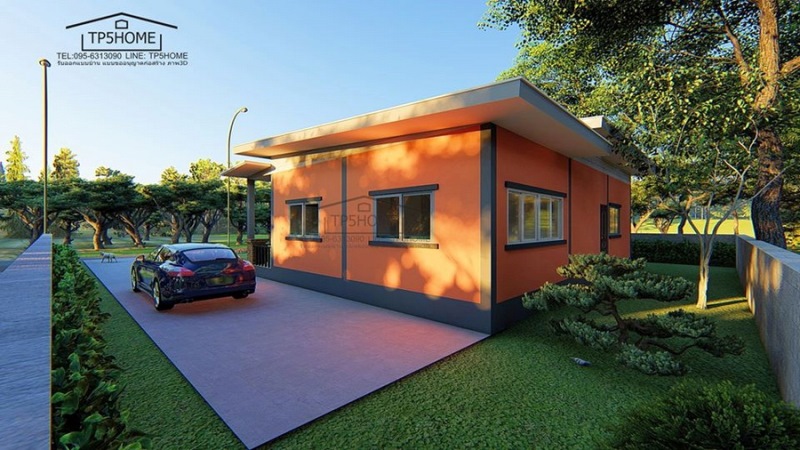 This bungalow house in a box-type shape emphasizes uniqueness and style. This design bursts in a blend of brown and signal orange hues with a little grey accent that generates a fascinating atmosphere. Particularly, this residence in warm shades keeps the exterior prominent.