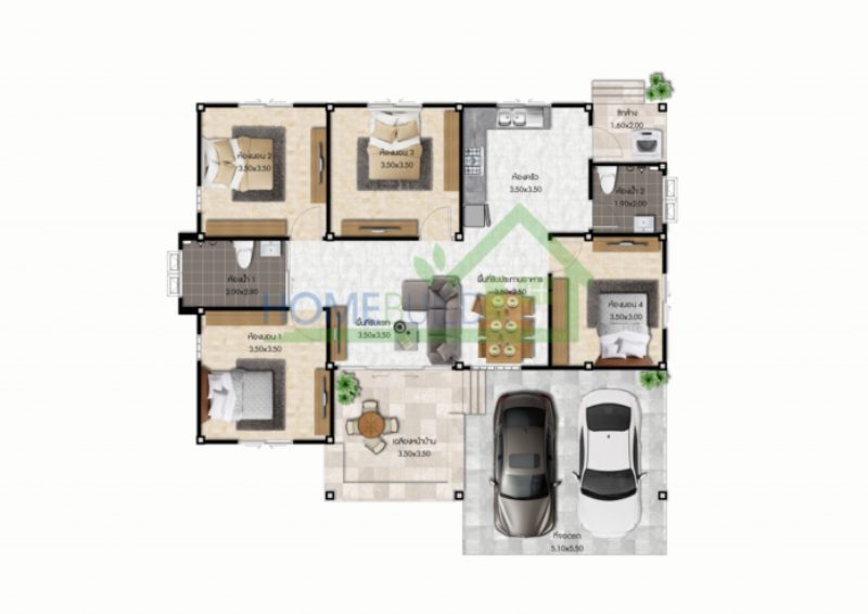 From the entry porch, you will be greeted by the living room through sliding glass doors. The living room opens to the dining room and kitchen in a free-flowing concept that stays in the middle of the plan. Three bedrooms occupy the left side of the layout while the fourth is on the right of the dining room. Meanwhile, one bathroom is located between two bedrooms on the left while the other unit sits beside the kitchen.